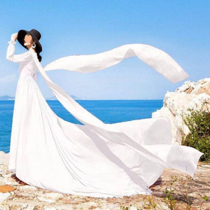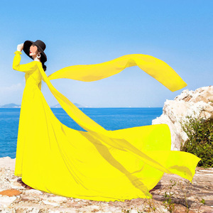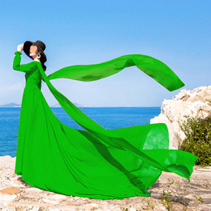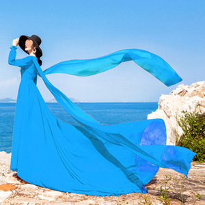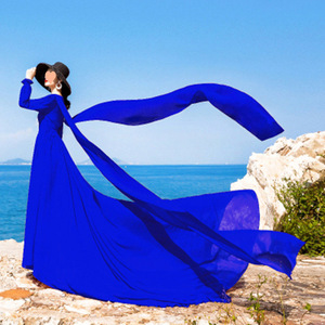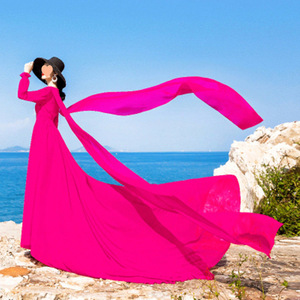 领复古大红色雪纺连衣裙拖尾长袖飘逸大摆海边度假裙旅拍长裙子