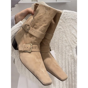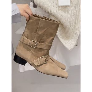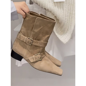 スポットグッズ!ニッチデザインショートブーツ女性用2025春秋スエードスクエアヘッドベルトバックルマーティンブーツ太ヒールスリムブーツ