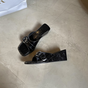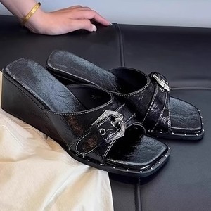フレンチウェッジ厚底スリッパ女性の夏のアウターウェア 2025 新しいスクエアトゥリベット黒本革サンダル高さを高める