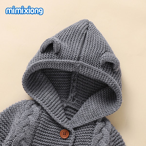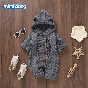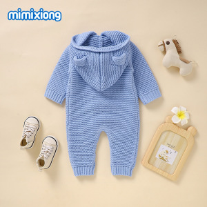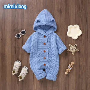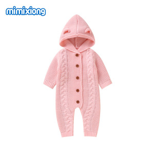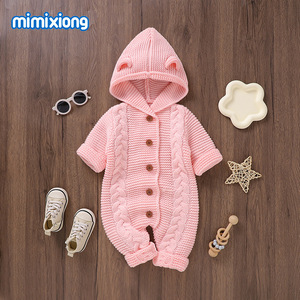 ins热卖春秋冬季新款婴幼儿纯色立体耳朵麻花条连体连帽哈衣爬服