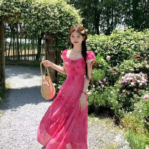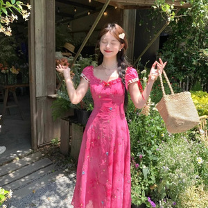 玫红色特别漂亮掐腰连衣裙夏女2025新款轻奢高级感收腰显瘦碎花裙