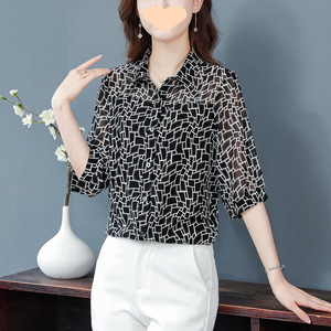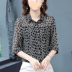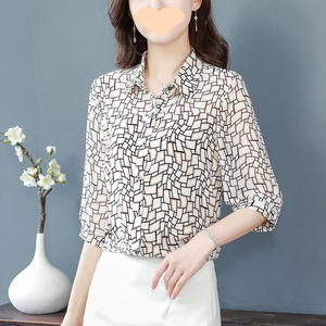 ママの春の七分袖シフォンレディースシャツ2025新しいルーズトップとお腹をカバーするスタイリッシュなシャツ