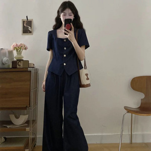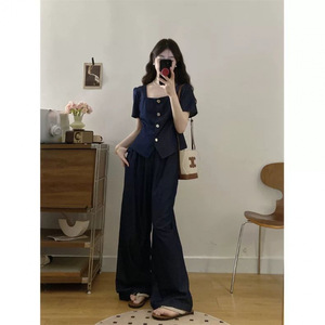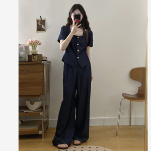 大きいサイズの夏服、年齢を軽減する服、太った女性のためのデニムトップス、ドレープワイドレッグパンツ、人気のスーツの完全なセット