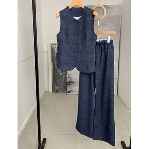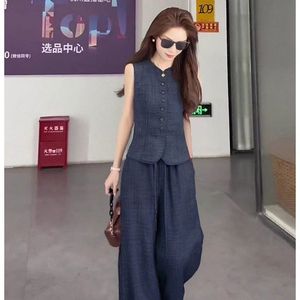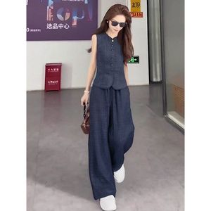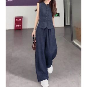 韓国の美しい夏の女性用小さなスーツ、夏の高級ピュアリネンスリムベスト、ワイドレッグパンツ、一式セット
