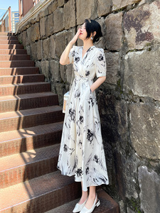 エレガントなスタイル半袖 V ネックスリムミッドレングス気質通勤ドレス 2025 夏ウエストストラップスプライシングスカート