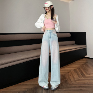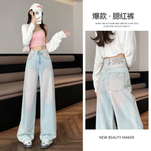 浅粉色腮红裤阔腿牛仔裤女夏季薄款2025新款刺绣高腰小个子直筒裤