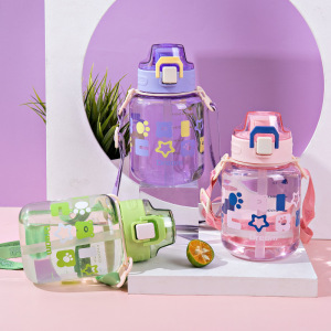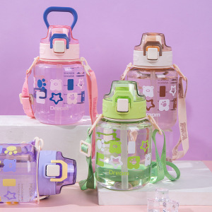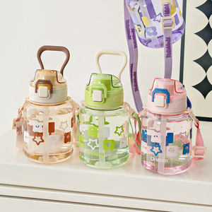 子供用ウォーターカップ、プラスチック製ビッグベリーカップ、見栄えの良い大容量、インターネットセレブストローカップ、漫画ストラップ、学生用トンウォーターボトル