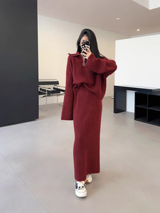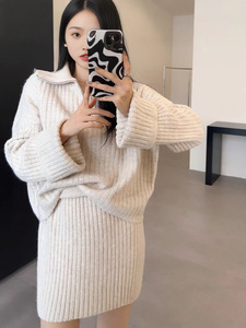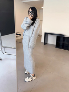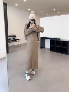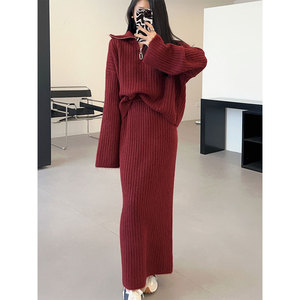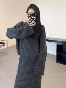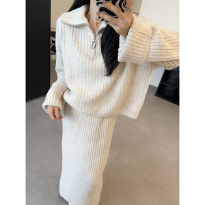 2025秋冬新款韩版宽松慵懒加厚翻领套头毛衣中长款半身裙两件套装