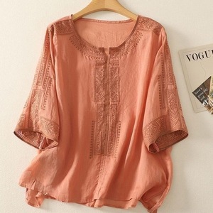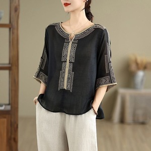 夏季宽松棉麻遮肉妈妈装中袖上衣文国风复古刺绣V领短袖T恤衫女装