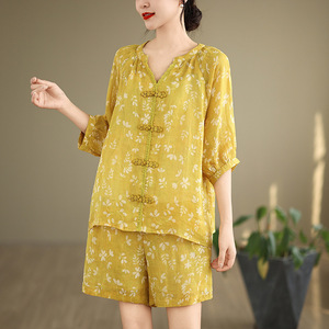 中国のレトロなボタン付き花柄ラミースーツ女性の夏のハイエンド年齢軽減痩身ワイドレッグショーツ綿とリネンの 2 点セット