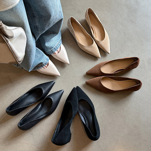 エレガントな通勤エレガントなポインテッドトゥウェッジヒール羊革スエード2025秋ミッドヒール本革浅い口内高さ増加靴女性用