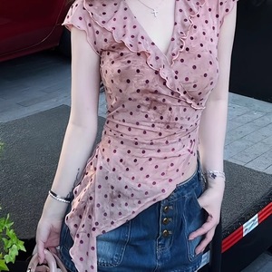 2025 韓国ピンク水玉縁 V ネックショルダー半袖 Tシャツ女性の夏薄い不規則なウエストショートトップ