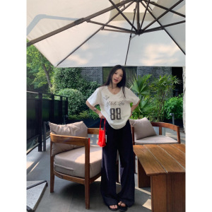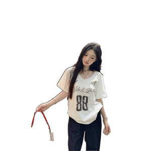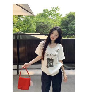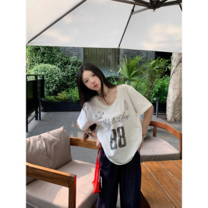 美式白色短袖t恤女V领蕾丝也有印花夏季宽松复古显瘦慵懒设计感上