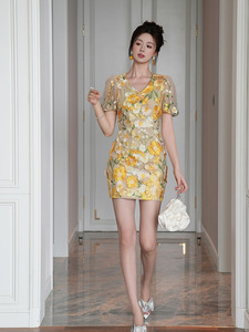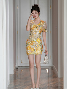 2025 新しい夏の女性のフレンチデザイン V ネック刺繍立体花スリムフィットヒップドレス 9028