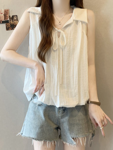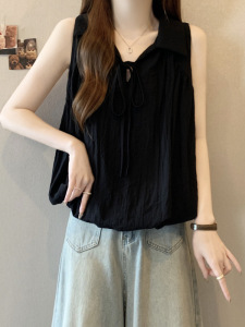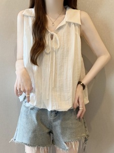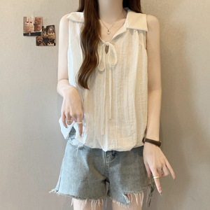 无袖V领背心衬衫女外穿夏季2025大码胖mm设计感系带短款花苞上衣