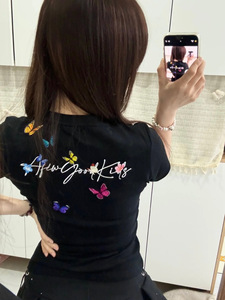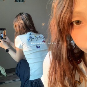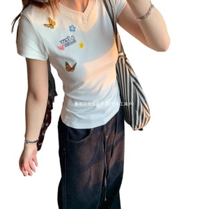 アメリカンサラウンドバタフライ刺繍フラワーカラー半袖シャツ女性用夏スリムフィットホットガールショートショルダートップ