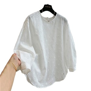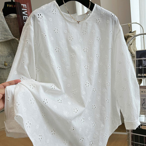 镂空钩花圆领长袖衬衫春夏新款白色韩版宽松休闲上衣气质显瘦小衫