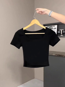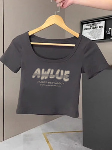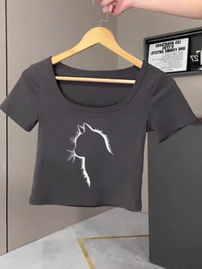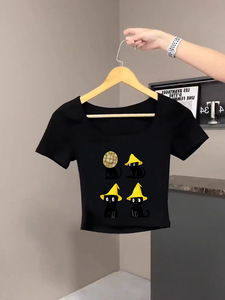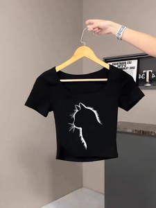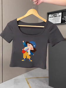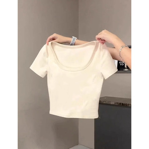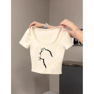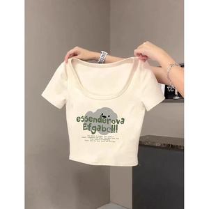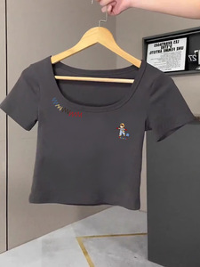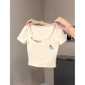 ヨーロッパ綿右肩襟半袖シャツ女性のスリムホットガールハイウエストショート年齢軽減漫画半袖トップ夏