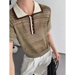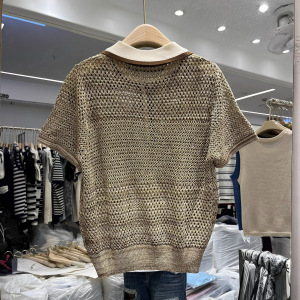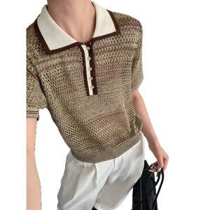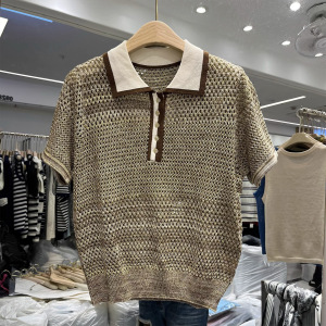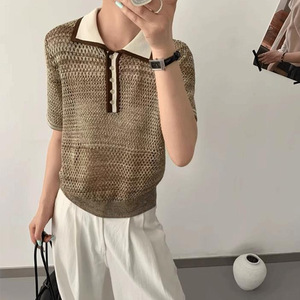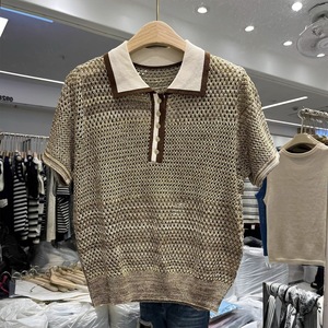 テンセルリネンニット半袖Tシャツ女性用2025新しい夏薄いルーズデザイン中空ポロトップ