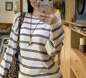 ストライプ長袖Tシャツアマゾンヨーロッパとアメリカンスタイルのクロスボーダー新しい多用途ルーズ薄手日焼け止めシャツ女性用ニットトップ