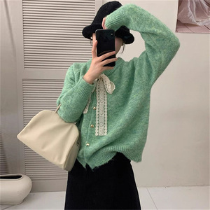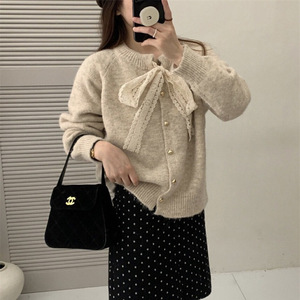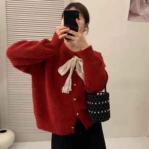 フレンチスイートスタイルの蝶結びニットカーディガン、女性用秋冬新作、無地ハートボタン付きラウンドネックセータージャケット