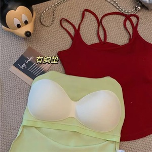 中空バックダブルショルダーストラップバックレスキャミソールレディース夏無地胸パッド付きスリムチューブトップ