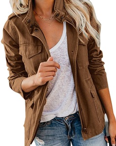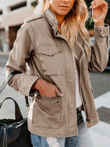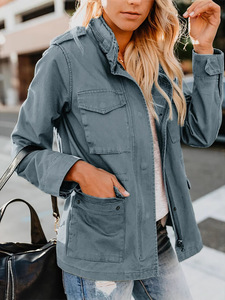 跨境欧美新款女装时尚宽松拉链多口袋翻领夹克长袖连帽外套LYY029