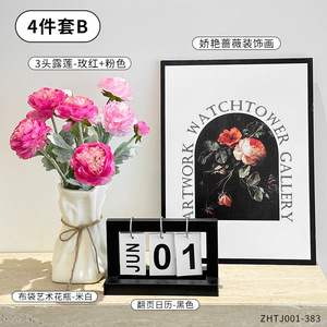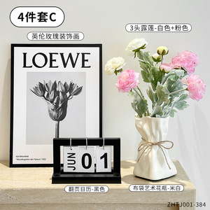 バッグアート花瓶 - オフホワイト + 露蓮 3 本 [ローズレッド + ピンク] + 装飾画