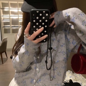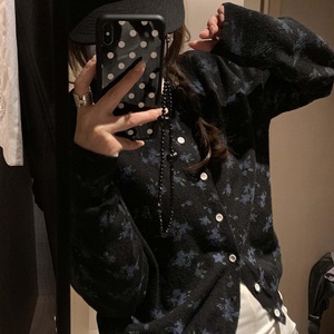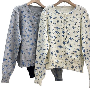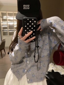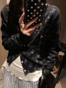 2025秋季新品蓝色小碎花圆领排扣针织衫开衫毛线衫外套叠穿上衣女