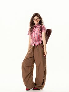 アメリカンレトロチェック柄ポロカラー半袖シャツレディース夏右肩痩身万能ショートシャツカーディガンジャケット