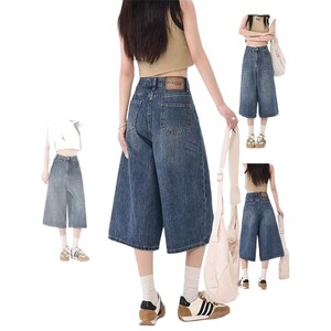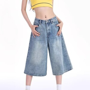 女性用7点ジーンズ、ワイドレッグ、2025年夏新作、ハイウエスト、ゆったり、着痩せ、万能、6点、7点、膝上ミドルパンツ