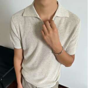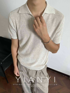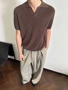 EME メンズ オールドマネースタイル ニューラッチ 高級夏 カモメ襟 綿麻糸 リラックス半袖ラペルセーター