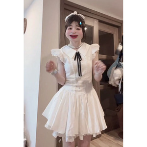 フレンチジェントルスタイルの小さなフライングスリーブホワイトドレス女性の夏の新しい甘いレースのリボンスカート
