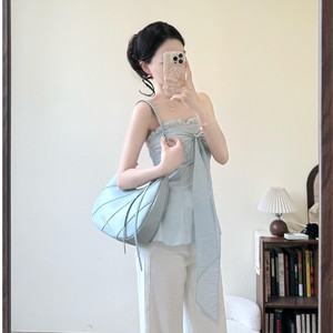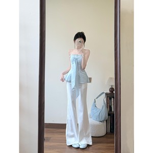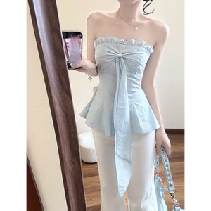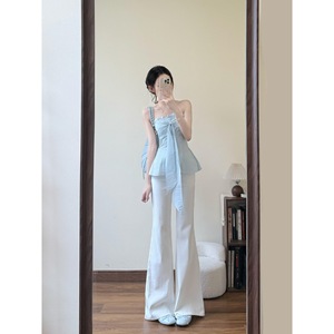夏の新しい甘い純粋な欲望スタイルミントブルーリボンチューブトップ女性のマイクロフレアジーンズスーツ