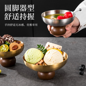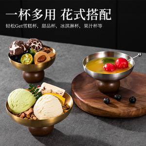 ステンレス鋼のゴブレットアイスクリームカップアイスクリームカッププディングカップフルーツプレートサラダプレート木製フットプレート軽食プレートデザートプレート