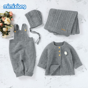 ins热卖款女宝宝套装纯色开衫外套+吊带哈衣爬服+帽子+毯子四件套