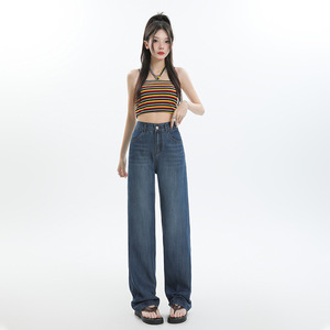 アメリカンレトロブルージーンズ女性のための 2025 夏薄いハイウエストワイドレッグルーズライトカラーの新しいフロアレングスストレートパンツ
