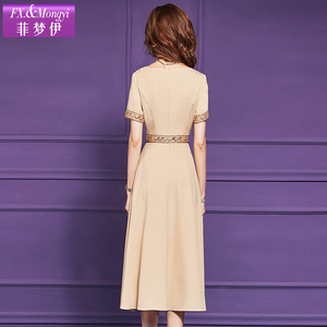 Feimengyi オリジナルカーキドレスレディース半袖サマードレスライト大人レトロハイエンドウエストラウンドネック A ラインスカート
