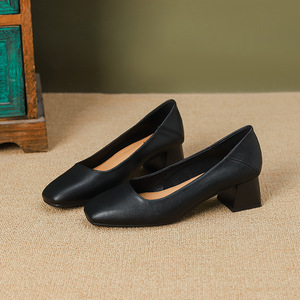软皮粗跟单鞋女2025夏新款中跟妈妈鞋浅口黑色职业高跟鞋面试工作