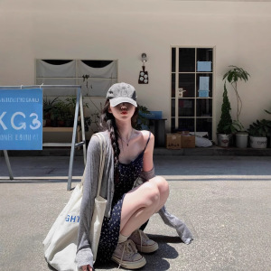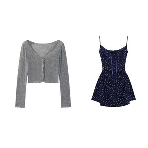 スイートガールスーツ薄い長袖グレーカーディガンコート女性の夏の花サスペンダードレスショートスカートツーピースセット