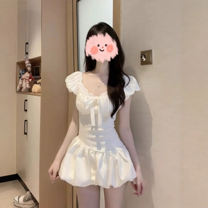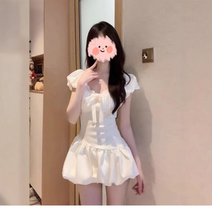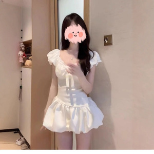 法式初恋少女感白色泡泡袖连衣裙女修身设计感蝴蝶结花苞短裙夏季