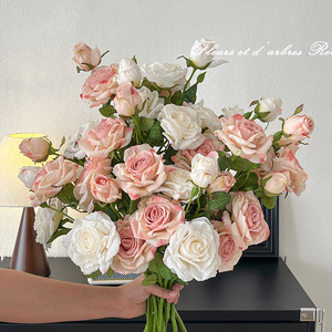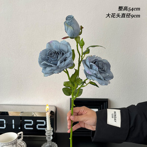 2花1蕊干枯烤边玫瑰花复古秋色仿真花假花装饰花摆件DIY花材外贸