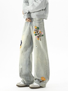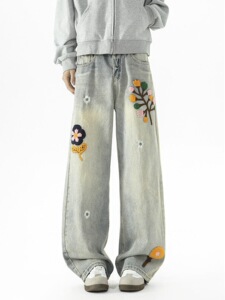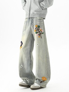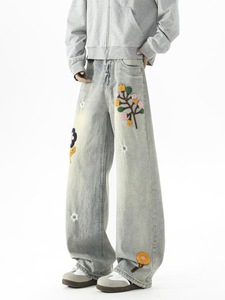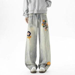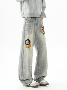 アメリカンフラワー刺繍ジーンズメンズ夏ハイストリートクリーンフィットマイクロフレアパンツトレンディブランドルーズワイドレッグパンツ