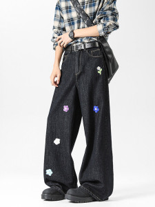 小花刺繍ジーンズメンズ 2025 夏新アメリカンレトロトレンディブランドルーズストレートワイドレッグカジュアルパンツ