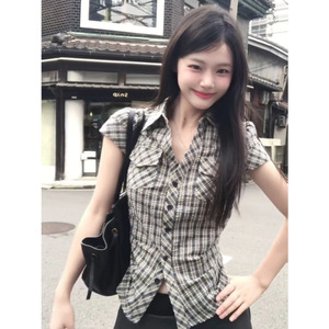 跨境美式复古格子短袖衬衫女2025年新款女装秋季爆款衬衣显瘦辣妹