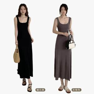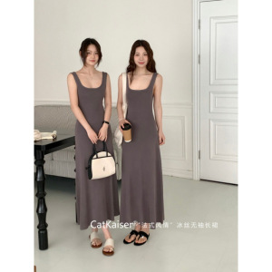 秋のインナーウェアに使えるキャミワンピース、アイスシルクのノースリーブロングワンピース、夏のミディアム丈無地タンクトップワンピース、フレンチスタイル
