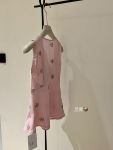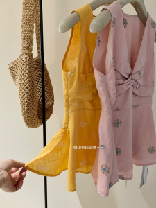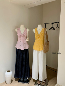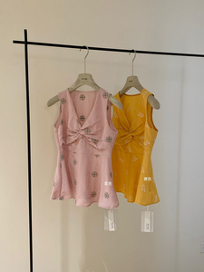 WGWE 夏の女性のフレンチピュアデザイア甘い刺繍フラワーデザインツイストウエスト V ネックベストシャツ W6238
