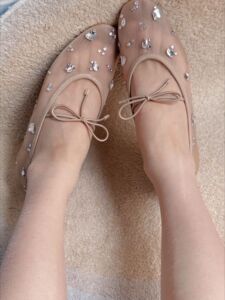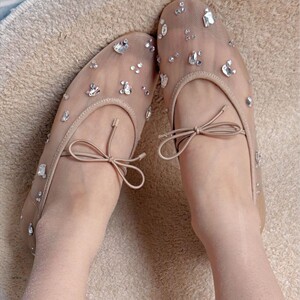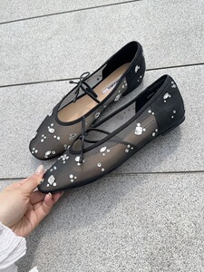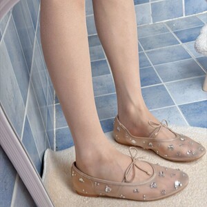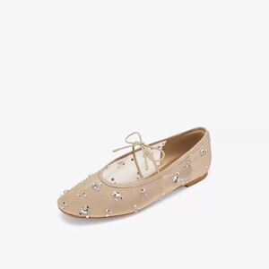 羊革スイインインと同じスタイルの靴、メッシュラインストーンリボンメリージェーンシューズ、レディース浅口シングルシューズ、バレエフラットシューズ
