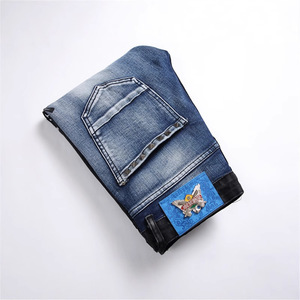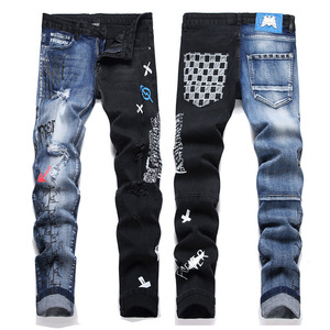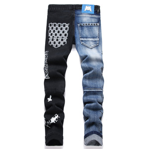 外贸男士浅蓝色牛仔裤破洞拼色弹力紧身时尚裤个性印花男长裤3538