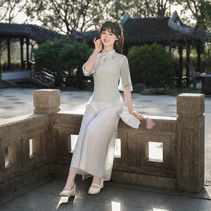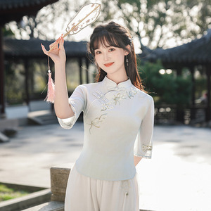 良質中国風夏綿とリネン半袖刺繍スタンドカラースリムレトロ文学茶服トップスーツ